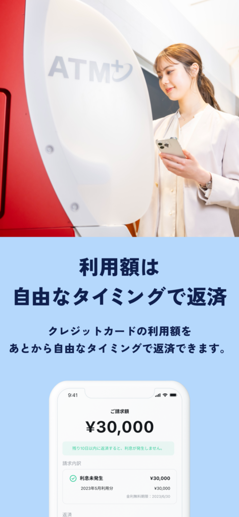 返済は利用の翌月末までに行えば利息はかかりません。給料日直後にまとめて返したり、大きな買い物をした直後にATMで返済したりと、デビットカードに近い感覚で支出をコントロールできます。万が一、翌月末を超えても、最低1,000円の支払いがあれば、残高に対して1日あたり0.05%の利息で柔軟に後払い(分割・リボ扱い)に移行できます。