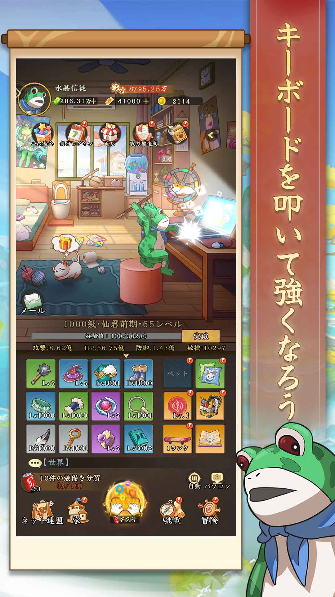 キーボードを狂ったように叩いて強い装備アイテムを集めていくゲームです。