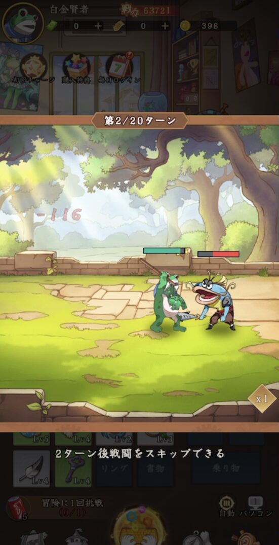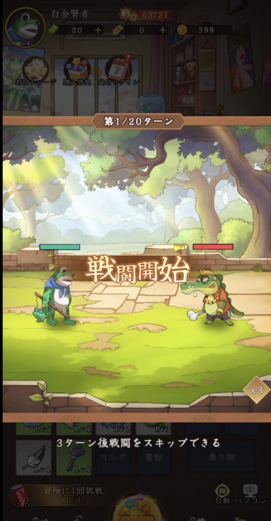 序盤からオート解放、戦闘は3倍速を使うことができるのでサクサク進みます。