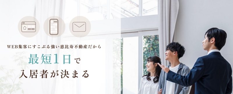 恵比寿不動産は、東京都渋谷区を拠点に賃貸管理を専門に行い、圧倒的なWEB集客力でオーナーから高い評価を受けている不動産会社です。物件のオーナー向けに、入居者の募集から契約、入居中のトラブル対応、退去後の原状回復まで、賃貸経営に必要な業務を一括で任せられる体制が整っています。