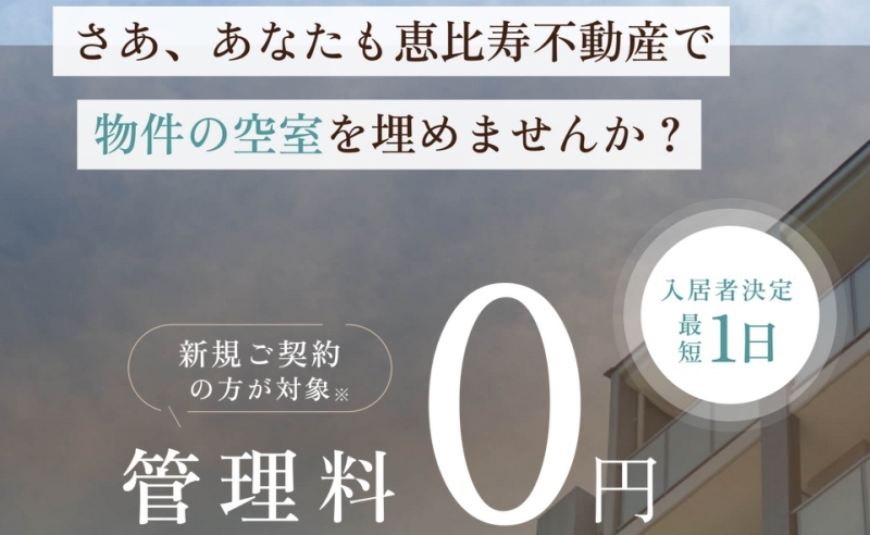 恵比寿不動産は、圧倒的なWEB集客力とSNSの運用力を駆使して、空室期間を大幅に短縮してくれる非常に優れた賃貸管理サービスです。専任契約を結ぶことで管理手数料が0円になるプランが用意されており、初期コストを抑えながら質の高い管理を任せられる点が多くの口コミで高く評価されています。