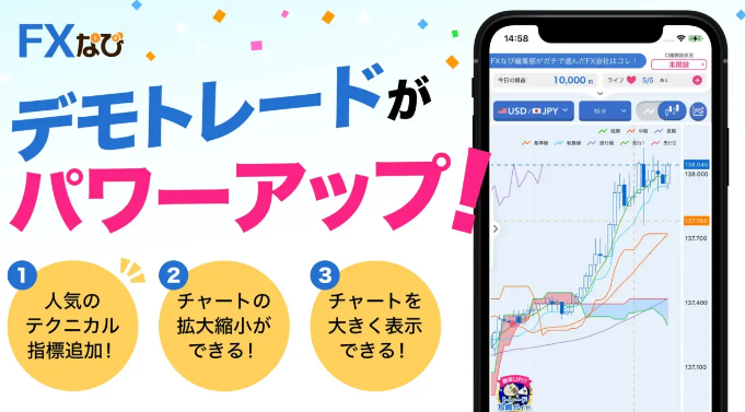 「FXなび」の最大の魅力は、このデモトレード機能にあります。実際のFX取引とほぼ同じチャート画面を使いながら、仮想の資金で売買を体験できます。