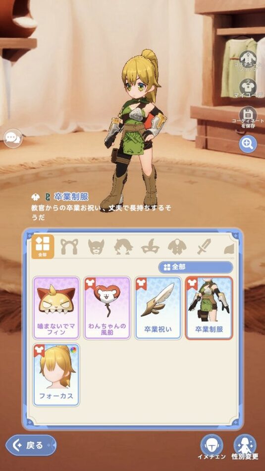 コスチュームショップで着せ替えが可能。
