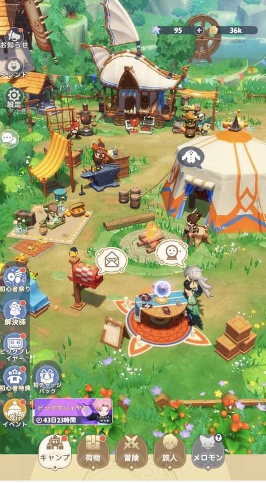 キャンプメニューではアバター・スキルガチャやショップ、他プレイヤーとのチャットなどを楽しめます。