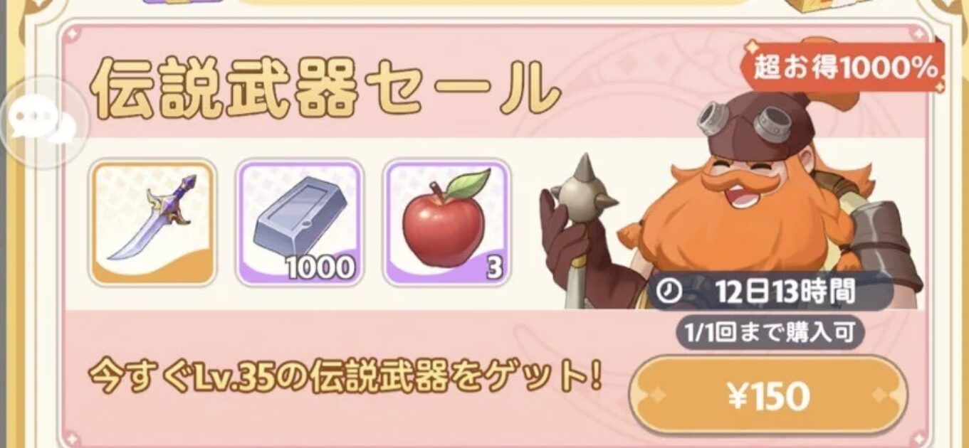 価格は150円でレベル35の最強武器と洗礼に必要な素材、試練のスタミナ回復アイテムが貰えます。