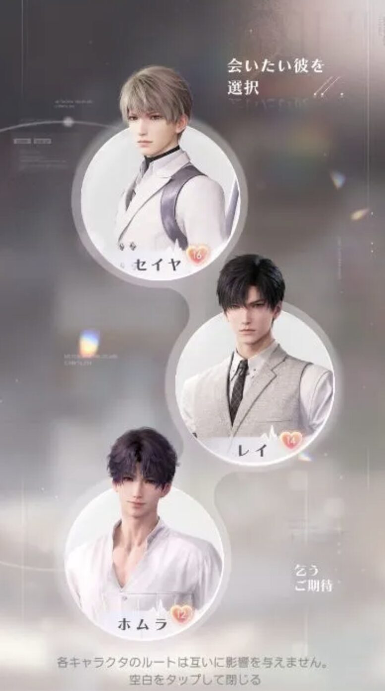 恋のお相手は、謎多き青年「セイヤ」、幼馴染の医師「レイ」、天才芸術家「ホムラ」の3人。