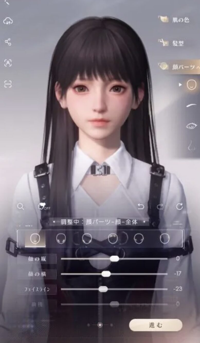 キャラメイクは髪型や瞳などの基本的な項目から、眉毛やフェイスラインなど細かな調整も可能です。