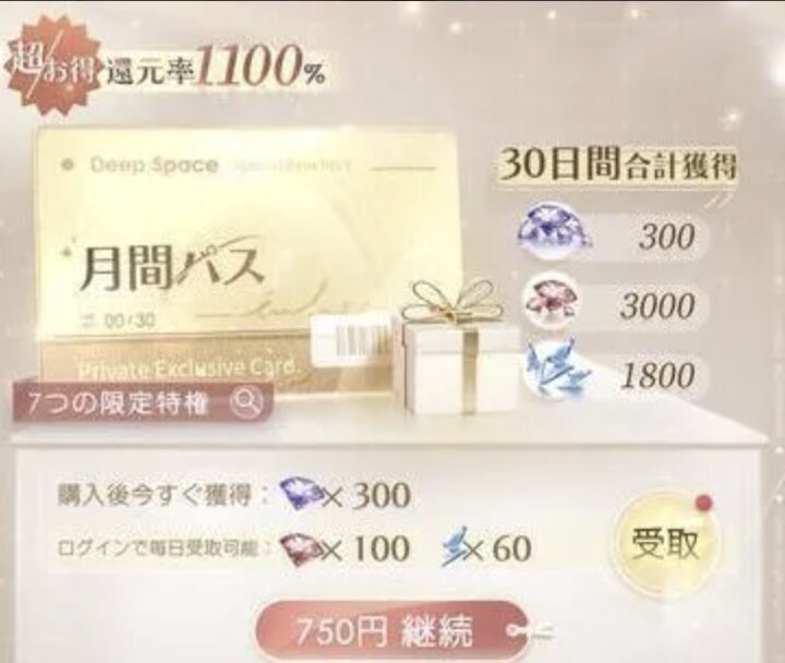 クリスタル300と30日間毎日ダイヤ100+体力60が獲得できかなりお得!