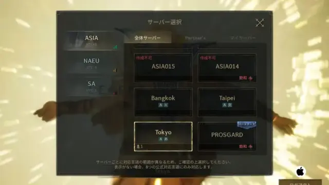 ゲーム開始時に最も重要なのがサーバー選択でTOKYOを選ぶことです。