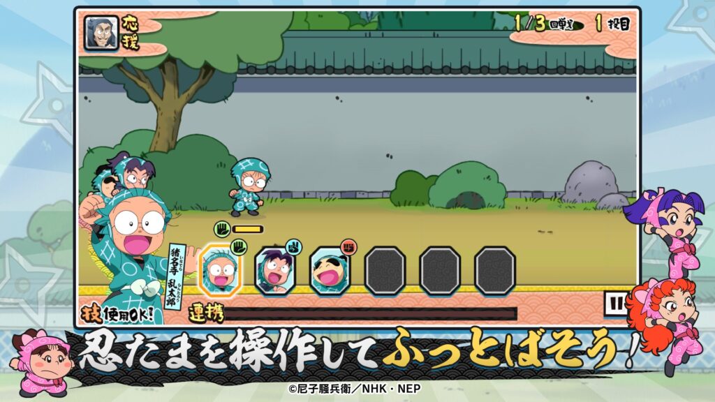 本作は国民的アニメ「忍たま乱太郎」のキャラクターたちを引っ張ってふっとばし、敵を倒していくカジュアルなパズルゲームです。