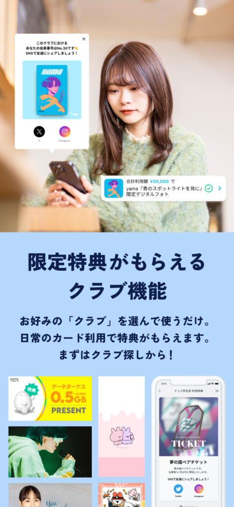 アプリ内には、アーティスト、スポーツチーム、アニメ、クリエイターなど150以上の「クラブ」が用意されています。ユーザーは自分の応援したいクラブを選択し、そのカードを利用することで、クラブの活動を支援できる仕組みになっています。