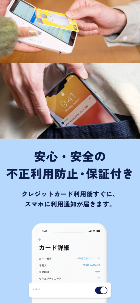 - カードロック機能:紛失時にアプリからワンタップで利用停止・再開が可能です。