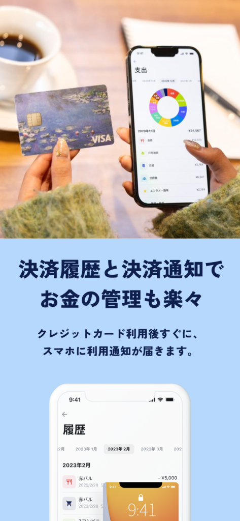 カードを利用すると即座にプッシュ通知が届き、履歴が反映されます。カテゴリ別の自動仕分け機能やグラフ表示により、家計簿の手間なく支出を可視化できます。