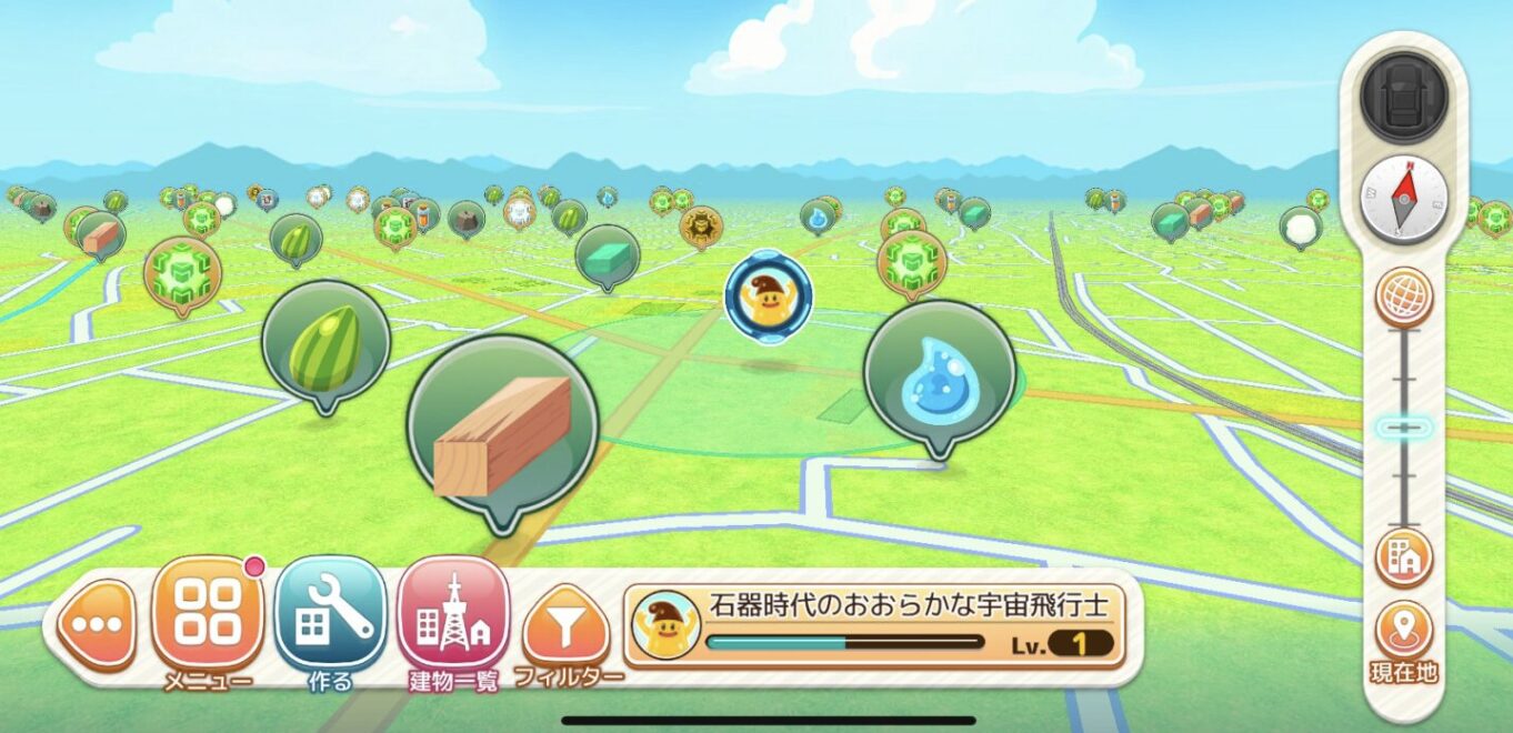 地図上に出現する素材や設計図などのアイテムを集め、クイズに答えながら建物を作っていくゲームです。