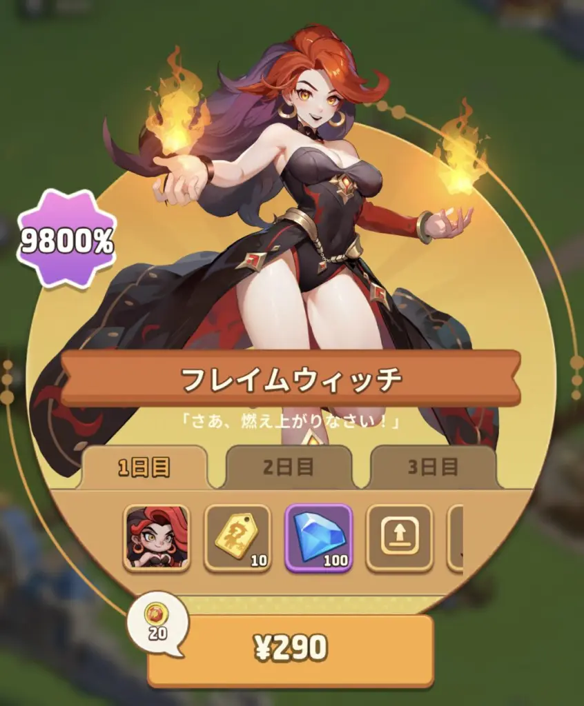 購入3日目に「フレイムウィッチの欠片」が20個入手でき、レベル上げを進めやすいのでおすすめです。